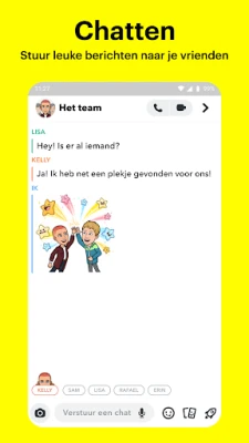 Snapchat biedt een dynamische en plezierige manier om je leven te delen. Maak snel foto's en video's met unieke filters, en stuur ze direct naar vrienden en familie. Deel je dagelijkse momenten via Verhalen en blijf op een creatieve wijze verbonden met de mensen die belangrijk voor je zijn. Expressie en plezier staan centraal.